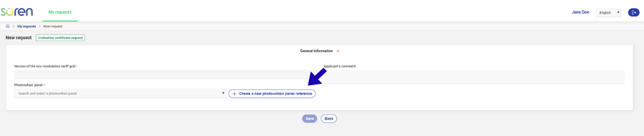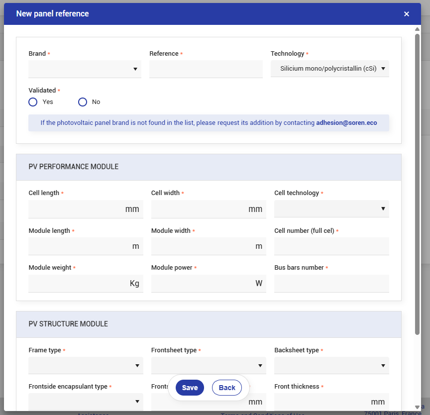 The photovoltaic panel reference you wish to evaluate does not exist in the app? You can create it by clicking on “+ Create a new photovoltaic panel reference“.