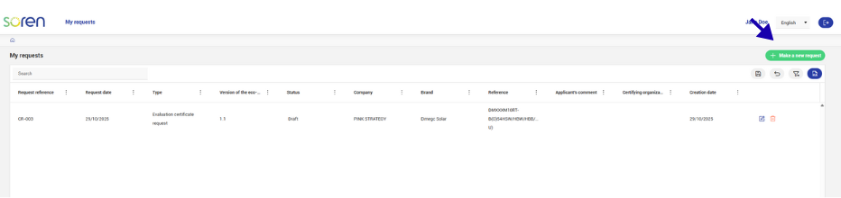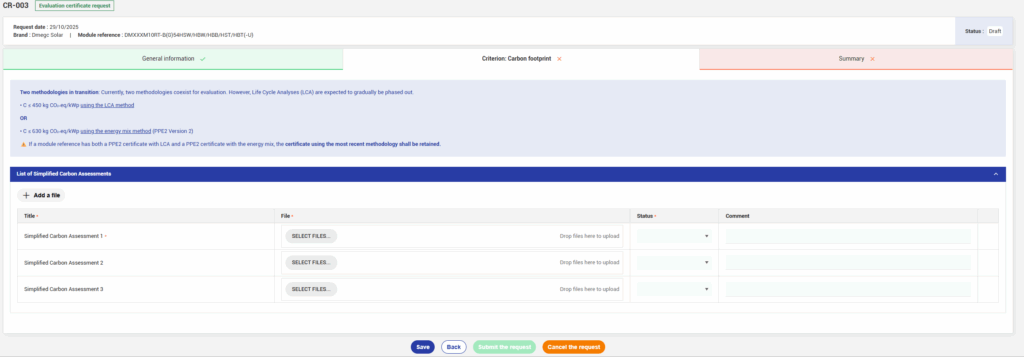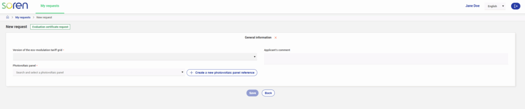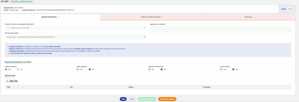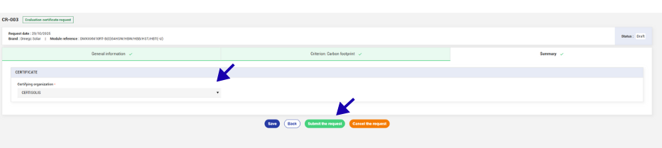 To submit a certificate request for a photovoltaic panel reference, you must have a user account and have registered a company.